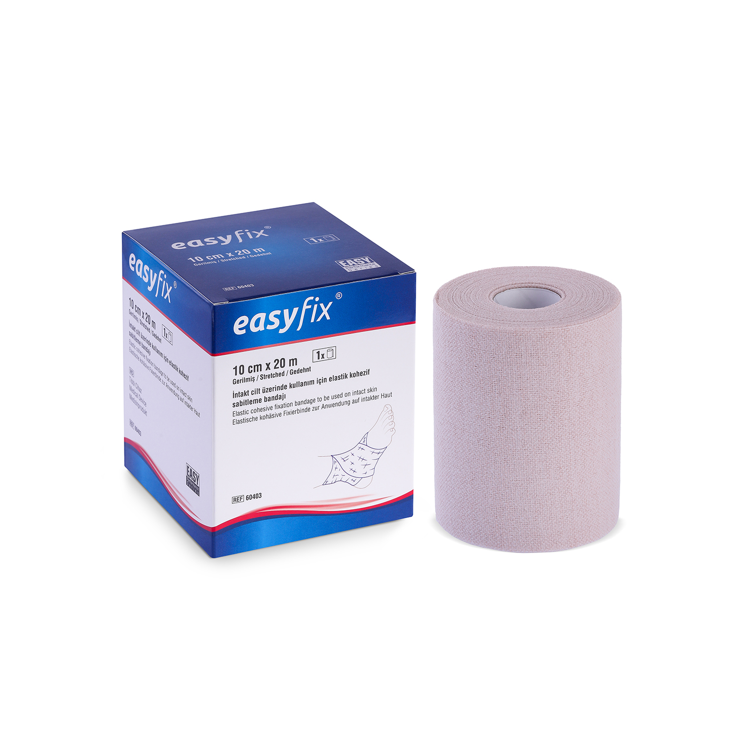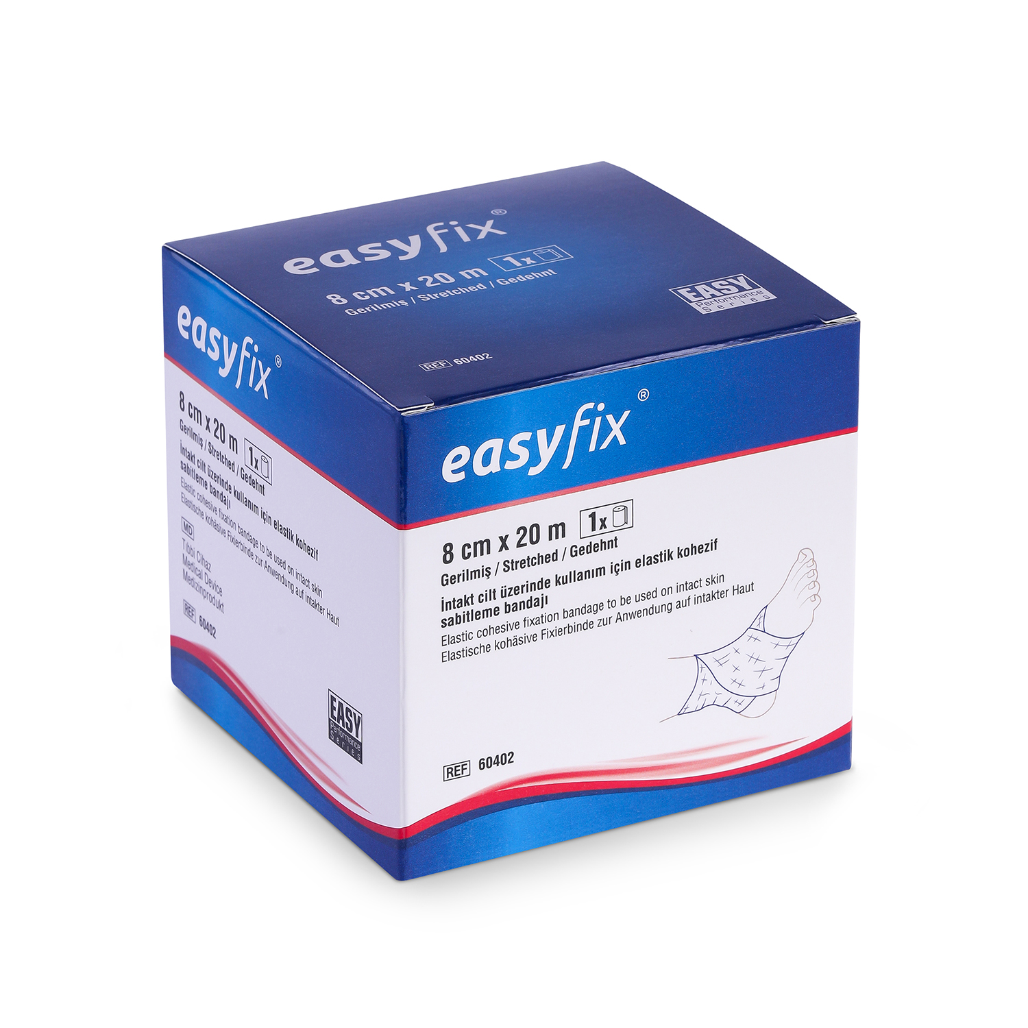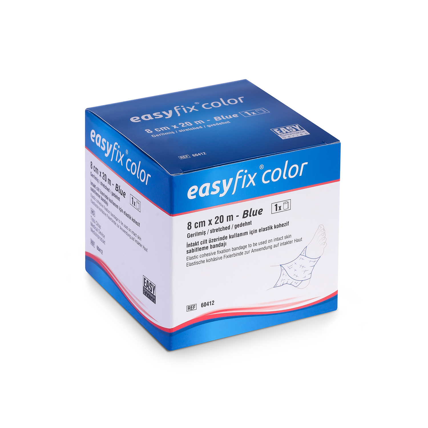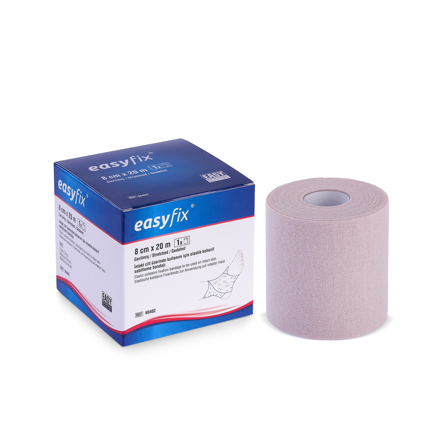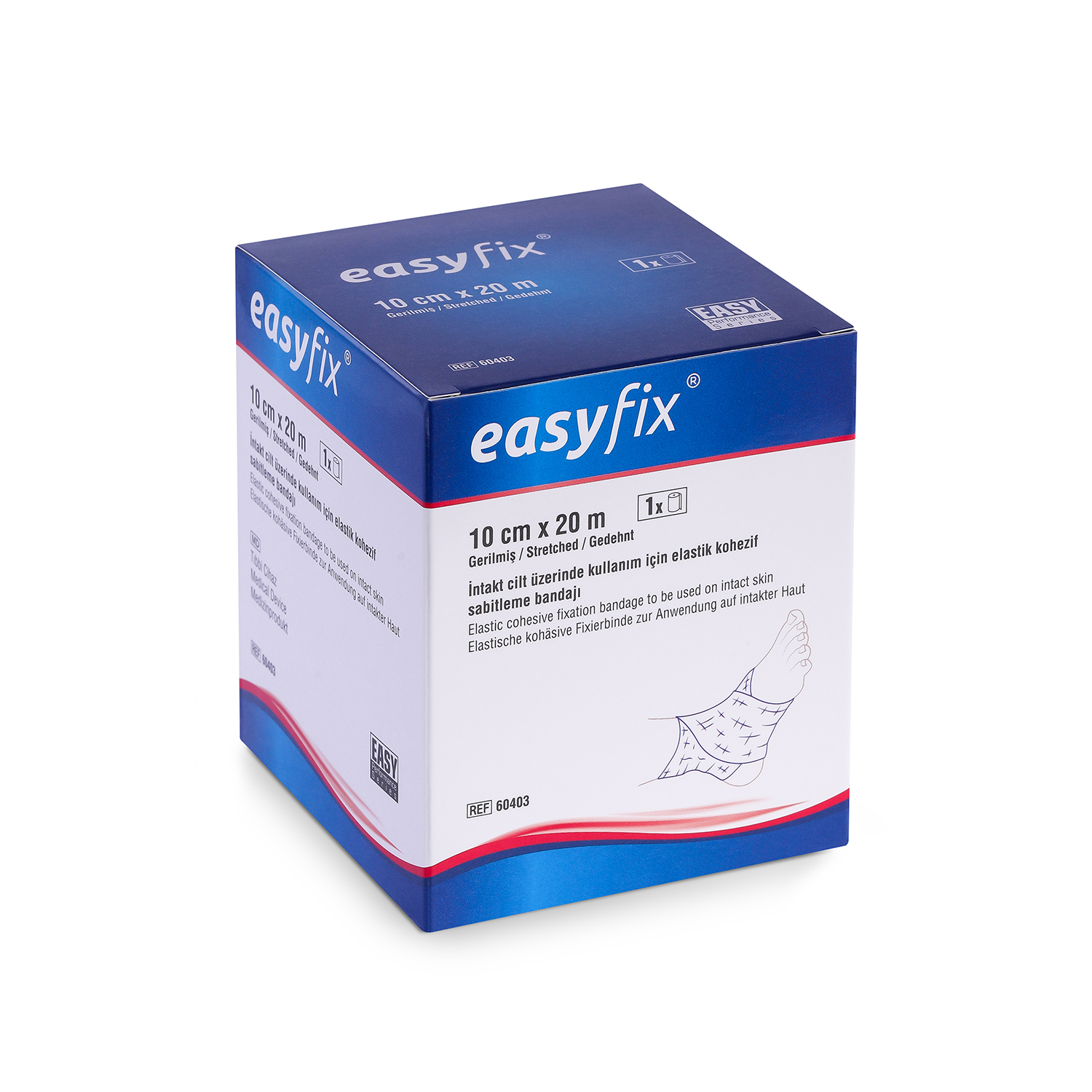 EASY FIX, %40 pamuk ve %60 poliyamit karışımlı özel dokusuyla geliştirilmiş, kendi üzerine yapışabilen (koheziv) elastik bir fiksasyon ve kompresyon bandajıdır. Ekstra ince dokuması ve cilde dost yapısı sayesinde, uygulandığı bölgede kaba bir görünüm oluşturmaz ve normal hareket kabiliyetini kısıtlamadan güvenli bir tutuş sağlar. Burkulma ve çıkıklarda destekleyici; ödem kontrolü, alçı altı koruma veya pansuman sabitleme işlemlerinde ise kaymayan yapısıyla ideal bir çözüm sunar. Uygulama esnasında 1/3 oranında üst üste bindirilmesi yeterli olan Easy Fix; sabit esneme özelliği, mavi ve sarı renk seçenekleriyle tedavide konfor ve güveni bir arada sunar.