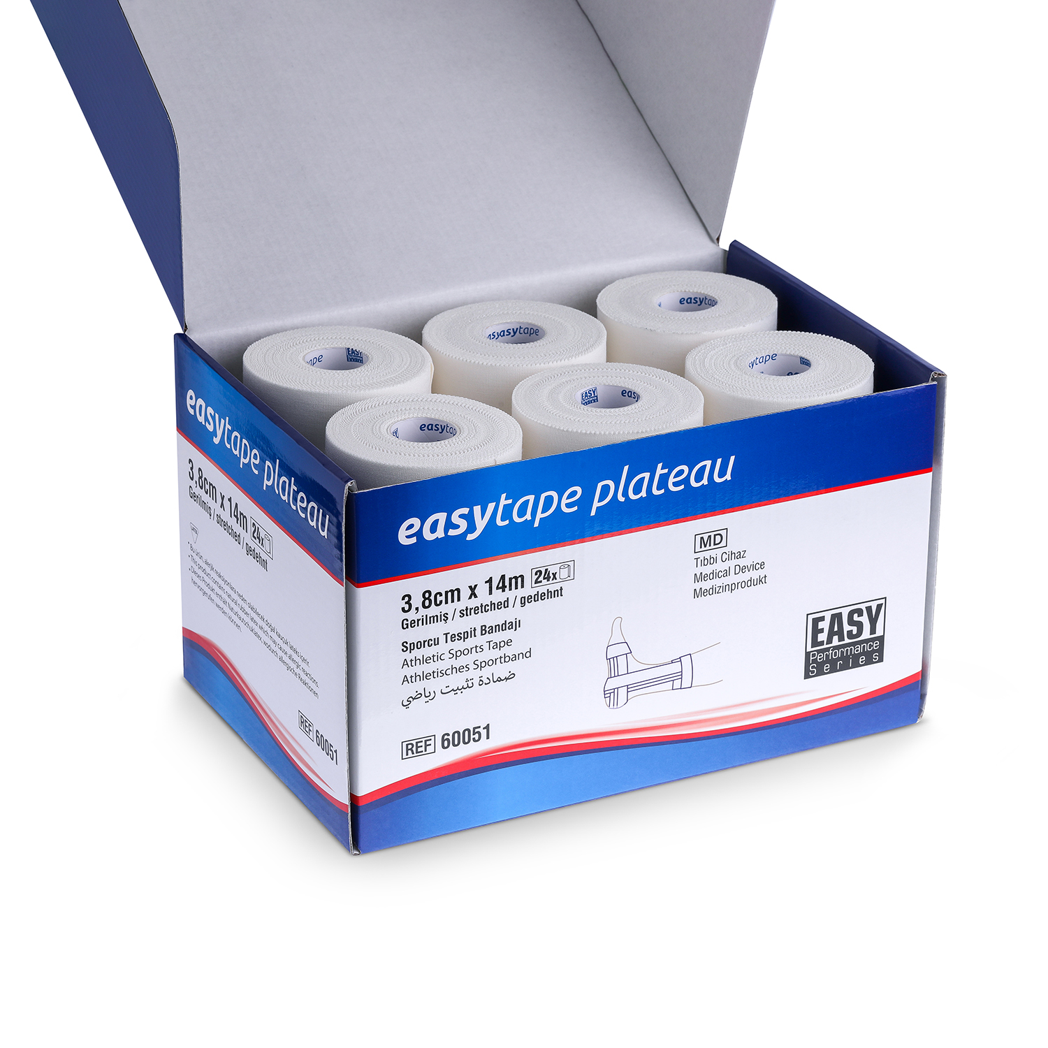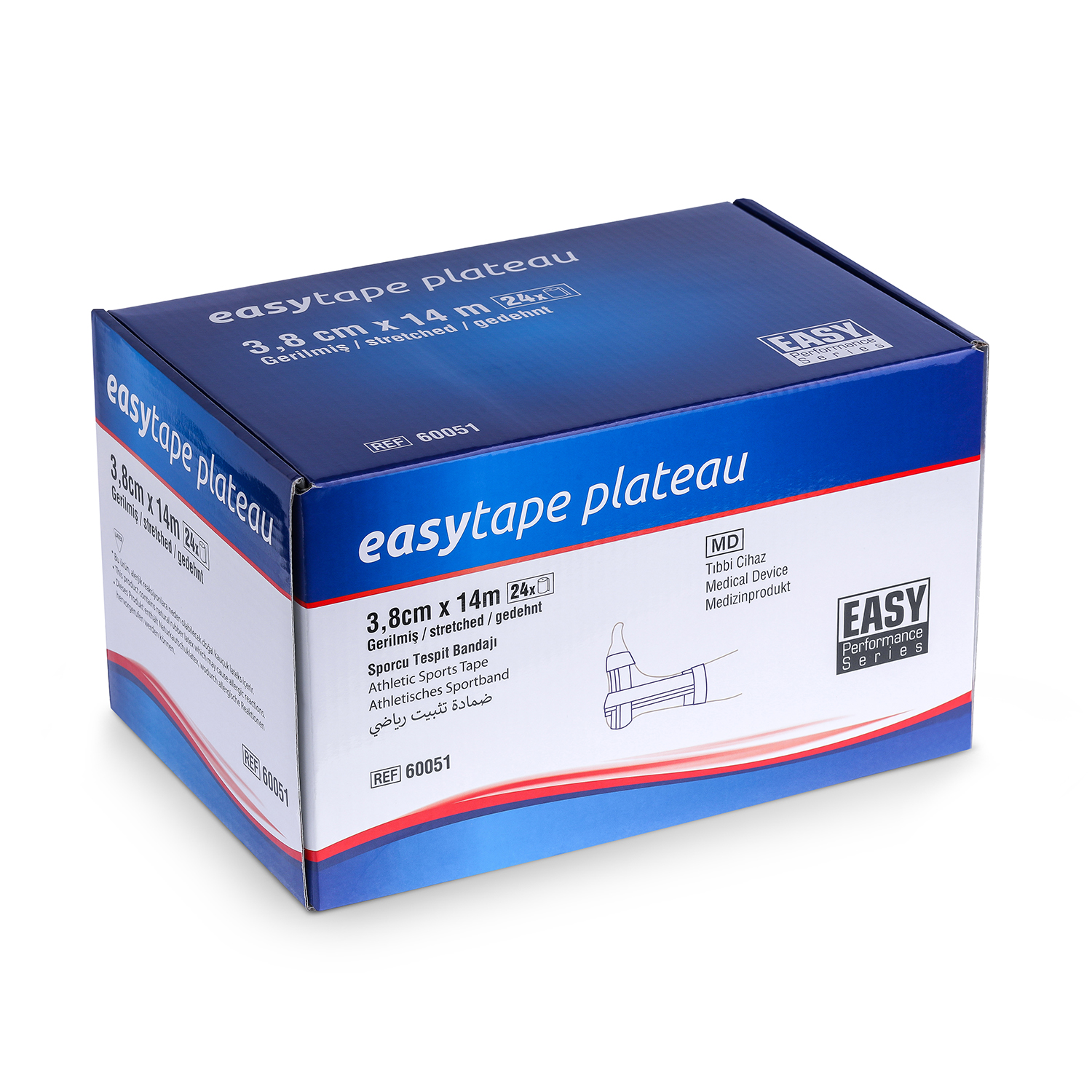 EASY TAPE PLATEAU (OLUKLU); şerit desenli (oluklu) özel yapışkan yüzeyi sayesinde, standart bantlara göre çok daha yüksek direnç ve tutuş sağlayan "Extra Fixed" özellikli rijit bir bandajdır. Çinko oksit içeren viskoz dokuması ve esnemeyen yapısı, sert eklem immobilizasyonunda ve spor yaralanmalarının profilaksisinde ihtiyaç duyulan maksimum desteği sunar. Lateks içermeyen hipoalerjenik formülüyle cilt hassasiyetini korurken, elle kolayca yırtılabilen yapısı pratik bir kullanım sağlar. Easy Tape Plateau, en zorlu yükler altında bile kayma yapmayarak tedavinize ekstra güç katar.